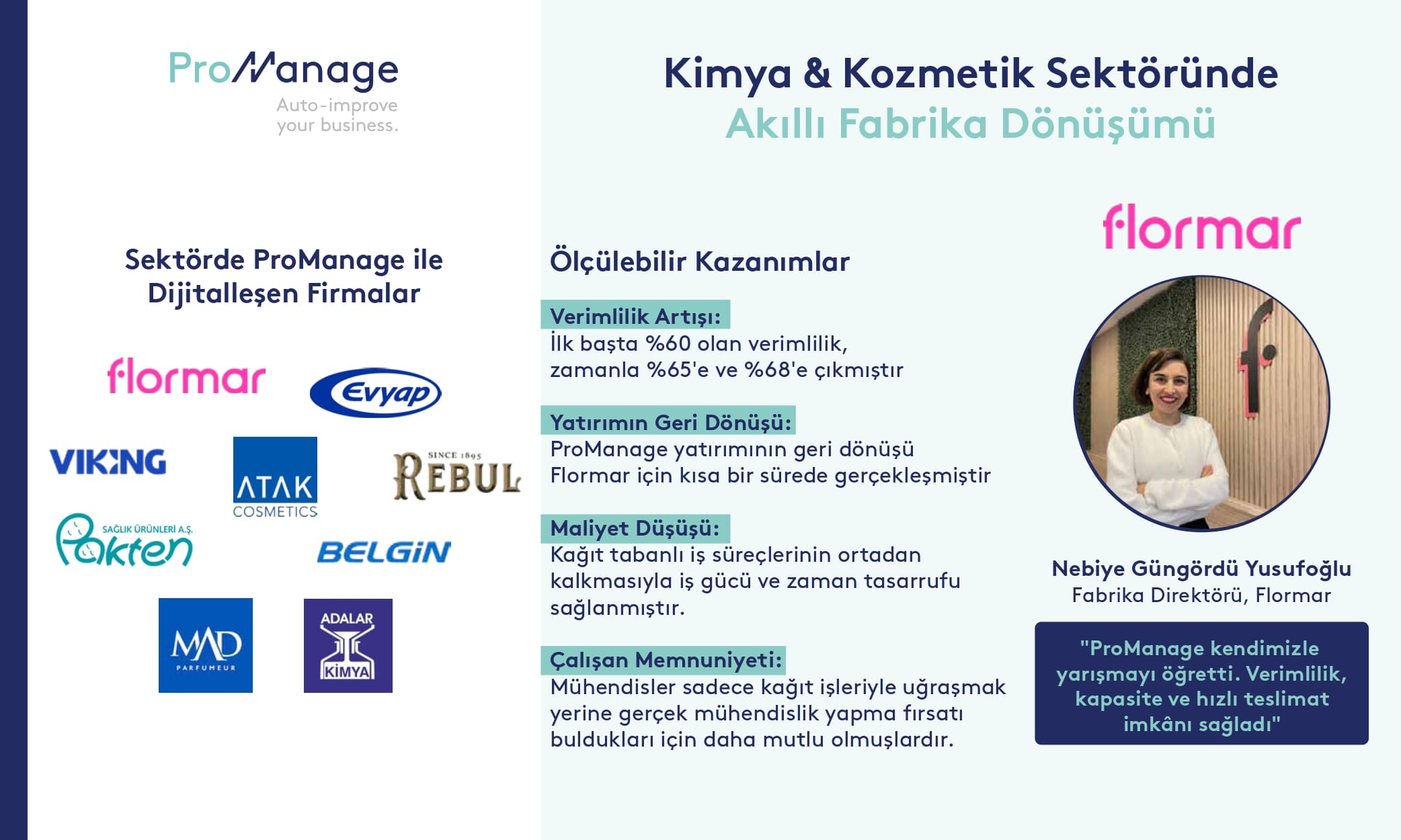 1950’lerde Milano’da doğan ve Türkiye’nin çok kültürlü yapısından ilham alarak büyüyen Flormar; günümüzde 70’ten fazla ülkede 500’ü aşkın mağazasıyla faaliyet gösteren global bir kozmetik devidir. “Mutluluk senin rengin” mottosuyla kadınların hayatına renk katan marka; yüksek performanslı ürünlerini geniş bir renk skalasıyla sunarken, sürdürülebilirlik vizyonu doğrultusunda temiz içerikler ve geri dönüştürülmüş materyaller kullanmaktadır. Hızlı tüketim (FMCG) dinamiklerine sahip bu büyük üretim operasyonunu daha verimli, çevik ve izlenebilir kılmayı hedefleyen Flormar, 2016 yılında dijital dönüşüm yolculuğunu başlatmış ve üretim hatlarında ProManage MES’i başarıyla devreye almıştır.
