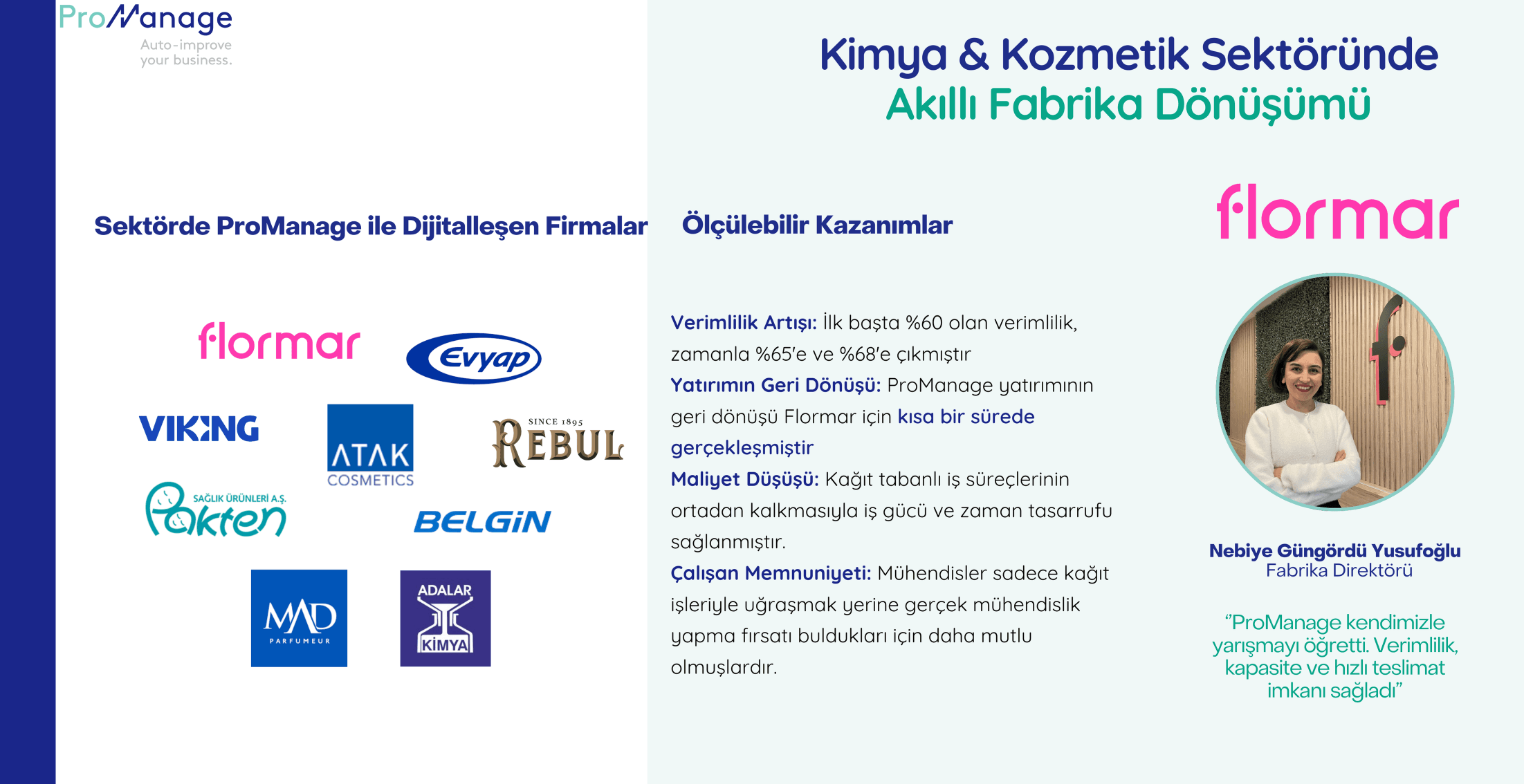 Flormar, 1950’lerde Milano’da doğmuş ve Türkiye’nin çok kültürlü yapısından ilham alarak büyümüş bir kozmetik firmasıdır. Günümüzde 70’ten fazla ülkede 500’den fazla mağazasıyla global bir makyaj markası olarak kadınların hayatına renk katmaktadır. Ürünlerinde yüksek performans ve geniş renk skalası sunulurken, sürdürülebilirlik vizyonuyla temiz içerikler ve geri dönüştürülmüş materyaller kullanılmaktadır. Flormar, “Mutluluk senin rengin” mottosuyla her güne başlanan, hızlı tüketim sektöründe faaliyet gösteren bir firma olup, 2016 yılından bu yana ProManage kullanıcısıdır. Flormar 2016 yılında Dijital Dönüşüm yolculuğunu başlatıp ProManage MES’i devreye almıştır.